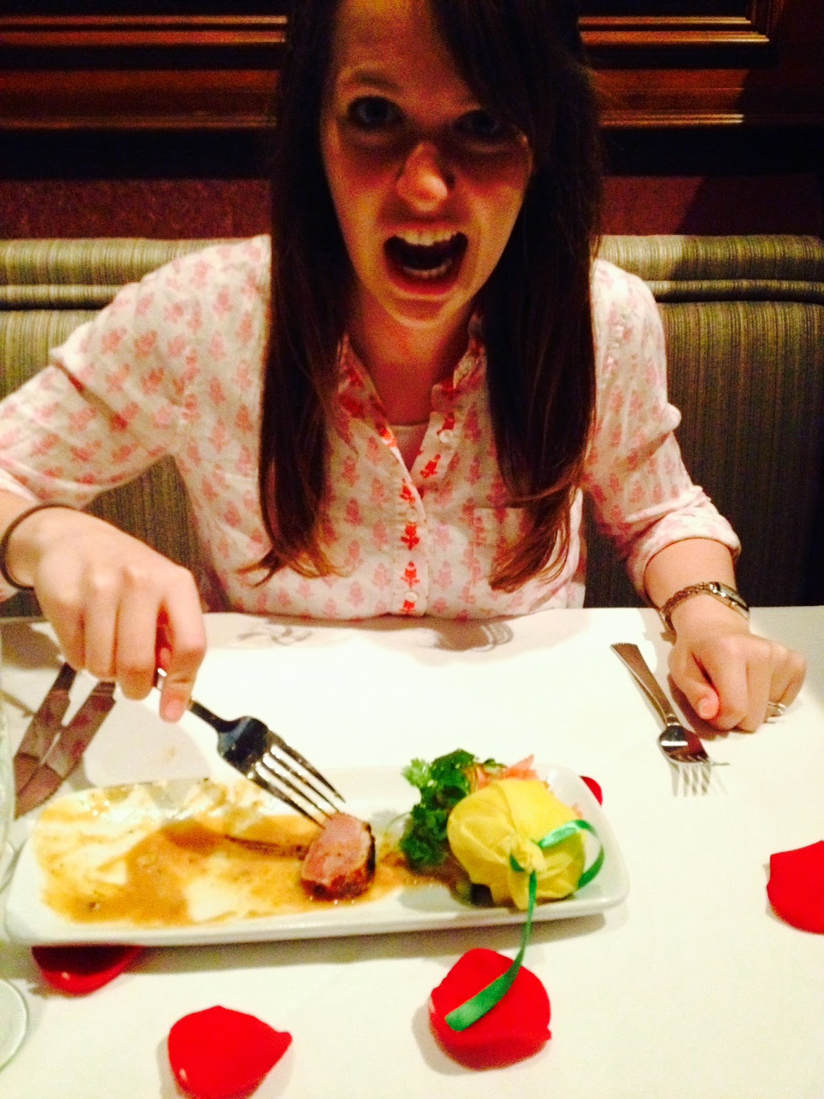 After the movie we drove to the other side of town for dinner. Nate had made us reservations at Ruth's Chris Steakhouse. We ate there the night we got engaged last year and wanted to go on our engagement anniversary this year but it's in Salt Lake so we couldn't. Celebrating our one year wedding anniversary seemed like a good occasion though! They were so kind to us and even had rose petals on the table for us :)